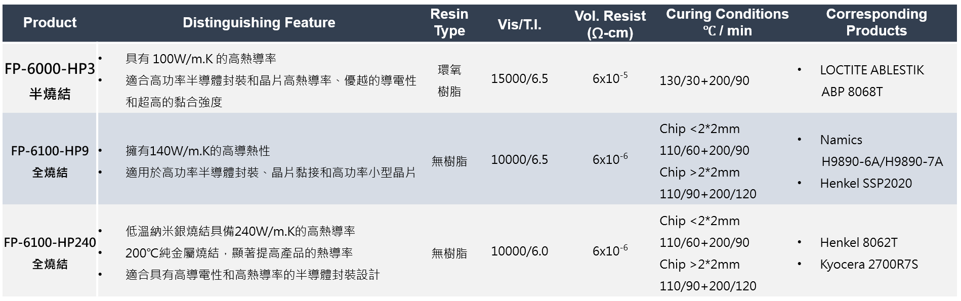 肥特補奈米級全燒結固晶銀漿- FP-6100-HP9,可用在需要高導電與高導熱的半導體封裝設計。為了獲得最佳性能,所使用的晶片和基板必須鍍金或鍍銀。不具樹脂成分,以純金屬接著,顯著提升產品的導熱性。